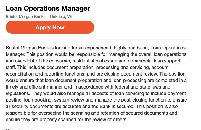 - A bank in Wisconsin is hiring a loan servicing manager. This person will focus on collecting payments, posting them promptly, and ensuring that exceptions are handled correctly. An exception might involve a borrower who over or underpaid a monthly payment. The payment ops team would need to decide what to do next. Refund the borrower, credit the amount to the next payment, or follow up with the customer to collect more funds. [2]