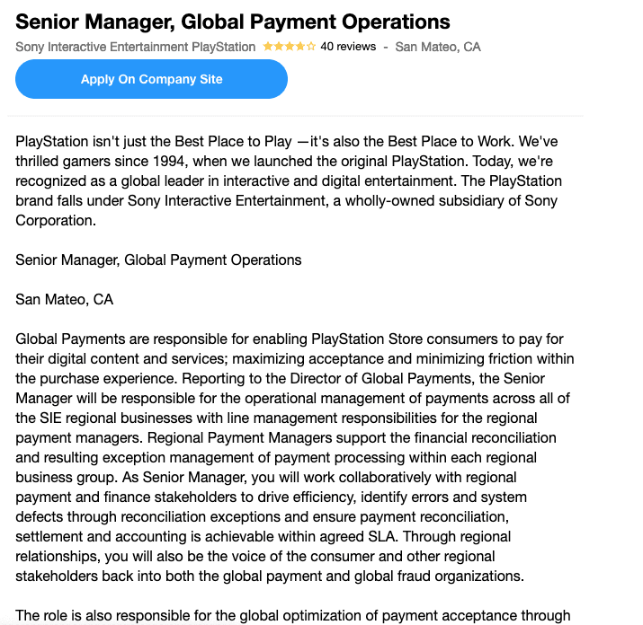 - Playstation is searching for a Manager of its Global Payment Operations team. The company’s main product is a video game platform. The payment ops team handles making sure that domestic and international payments go through. The team’s task is not only the daily reconciliation and settlement of all the payments that normally happen for a business but doing so with unique payment schemes in each country. [5]