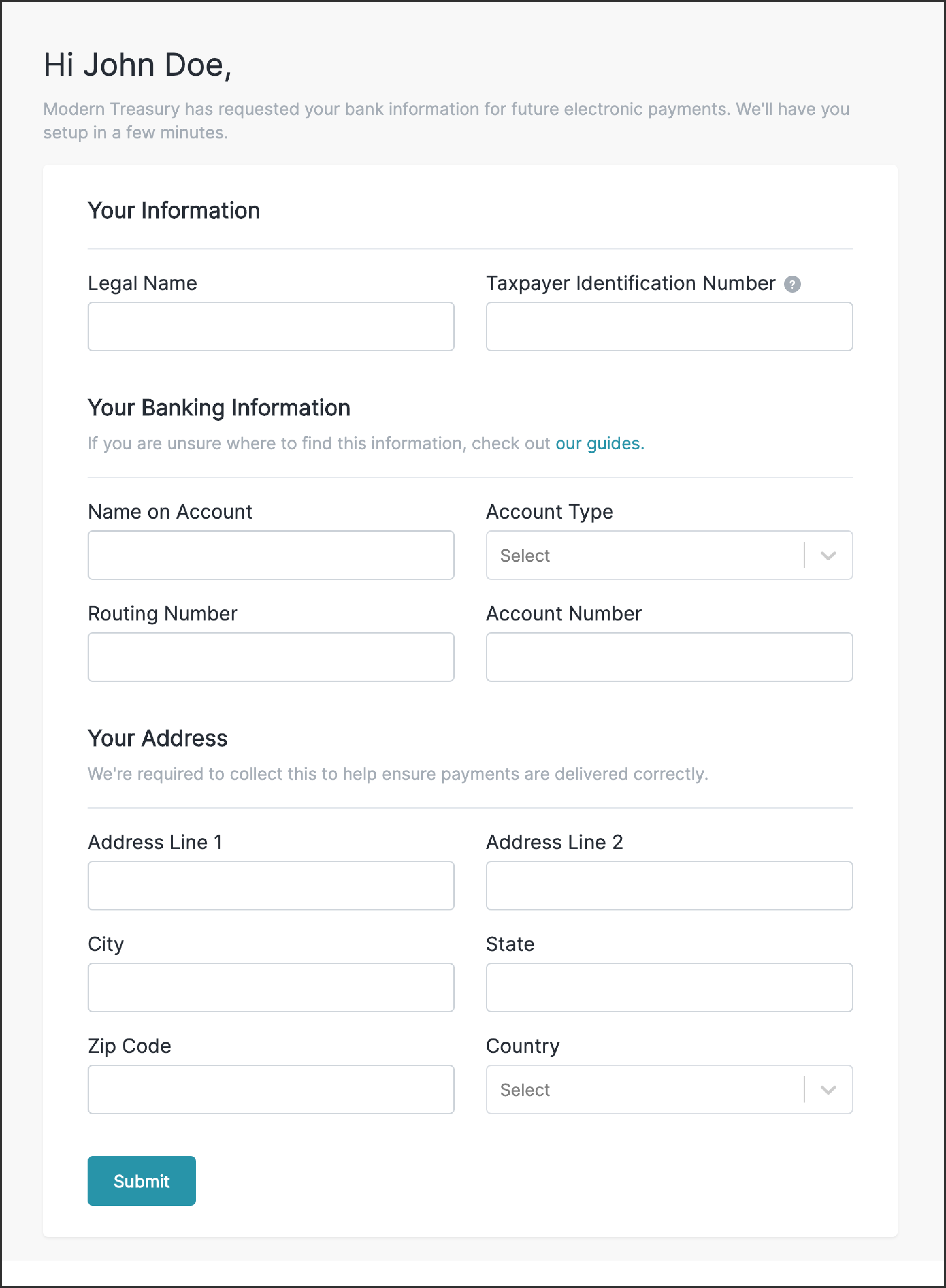If you collect your counterparty’s SSN or EIN in your own application, the second option is to provide it to Modern Treasury via our API when creating a counterparty.