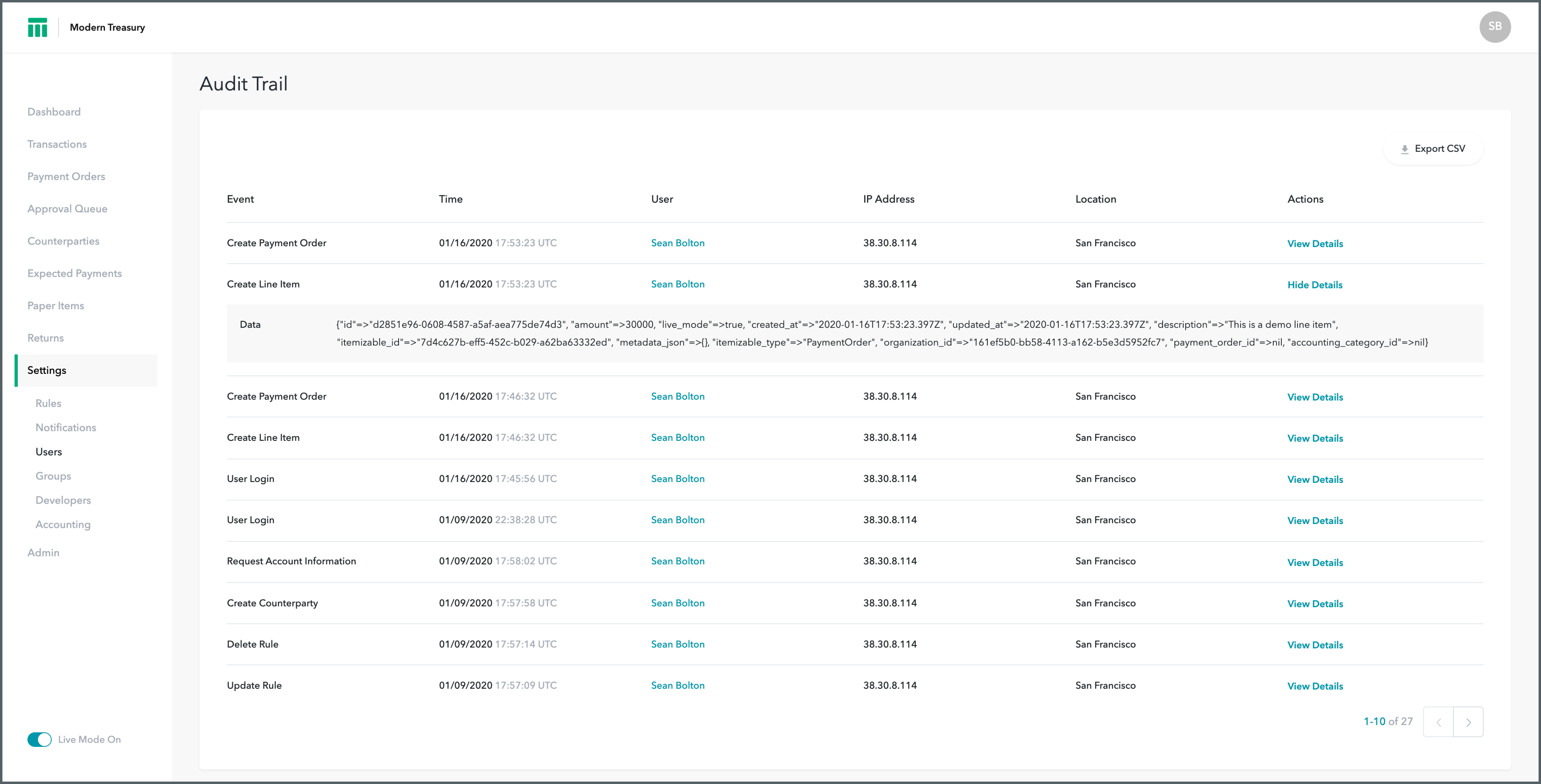 Modern Treasury users who are admins can view a log of all actions including IP address and approximate location. This is great for determining who performed an action and what exactly was changed. You can see more about each logged event by clicking the View Details action on the audit log. As elsewhere in the app, CSV exports are available for audit logs.