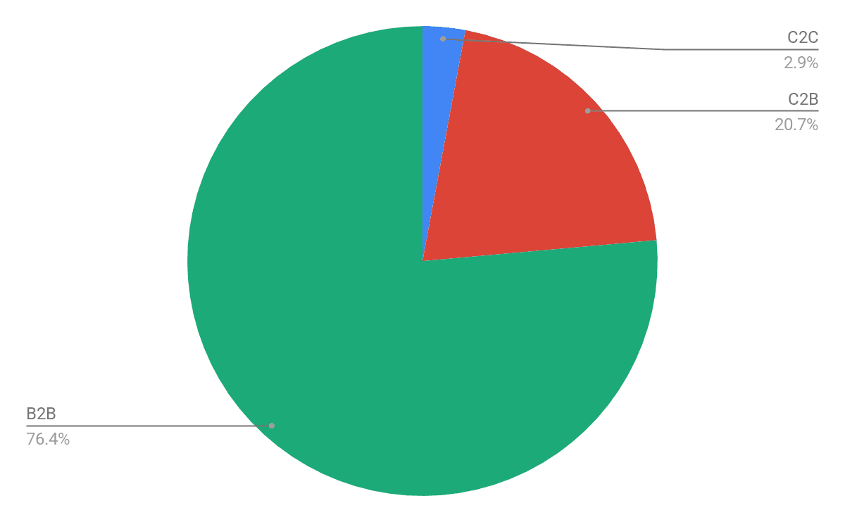There are two categories of business payments. The first, C2B, stands for money that moves between a consumer and a business ("consumer-to-business"). For example, buying clothing online or paying for something in a store. This volume was recently estimated to be $5 trillion dollars and follows the payment methods outlined above. The second category, B2B payments, refers to businesses paying businesses ("business-to-business"). For example, a business paying suppliers or wholesalers or a corporation paying a consulting firm. B2B payments sum to a whopping $18.5 trillion, which is over 76% of payments in the United States.
