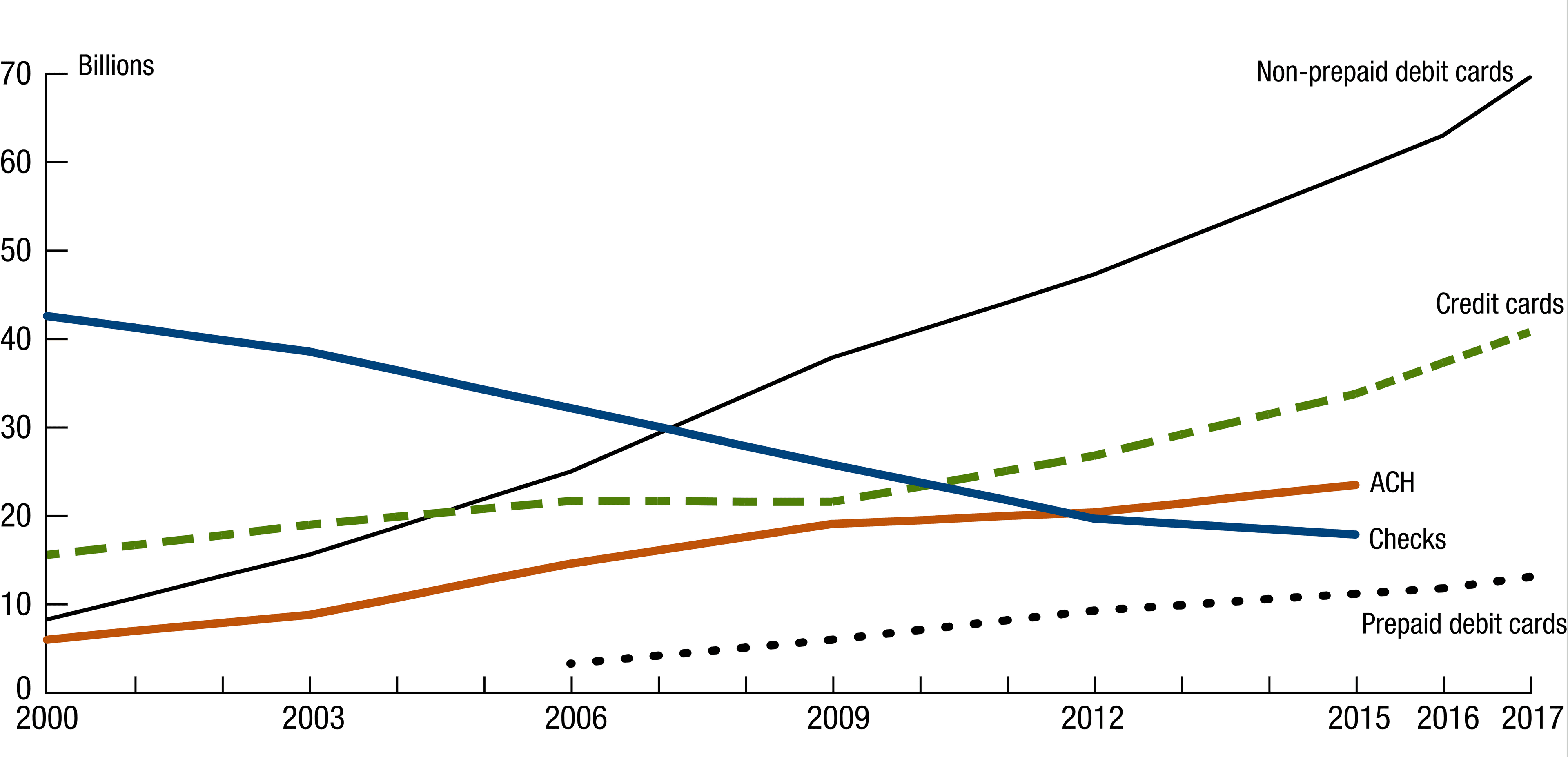 Over the last two decades, we have seen consumer payments change drastically. Debit card spend is on the rise as check payments fall, and we now pay each other with peer-to-peer systems such as Venmo (more on building those types of companies here). Here’s a summary from the Federal Reserve of shifting consumer payment methods over the last two decades:
