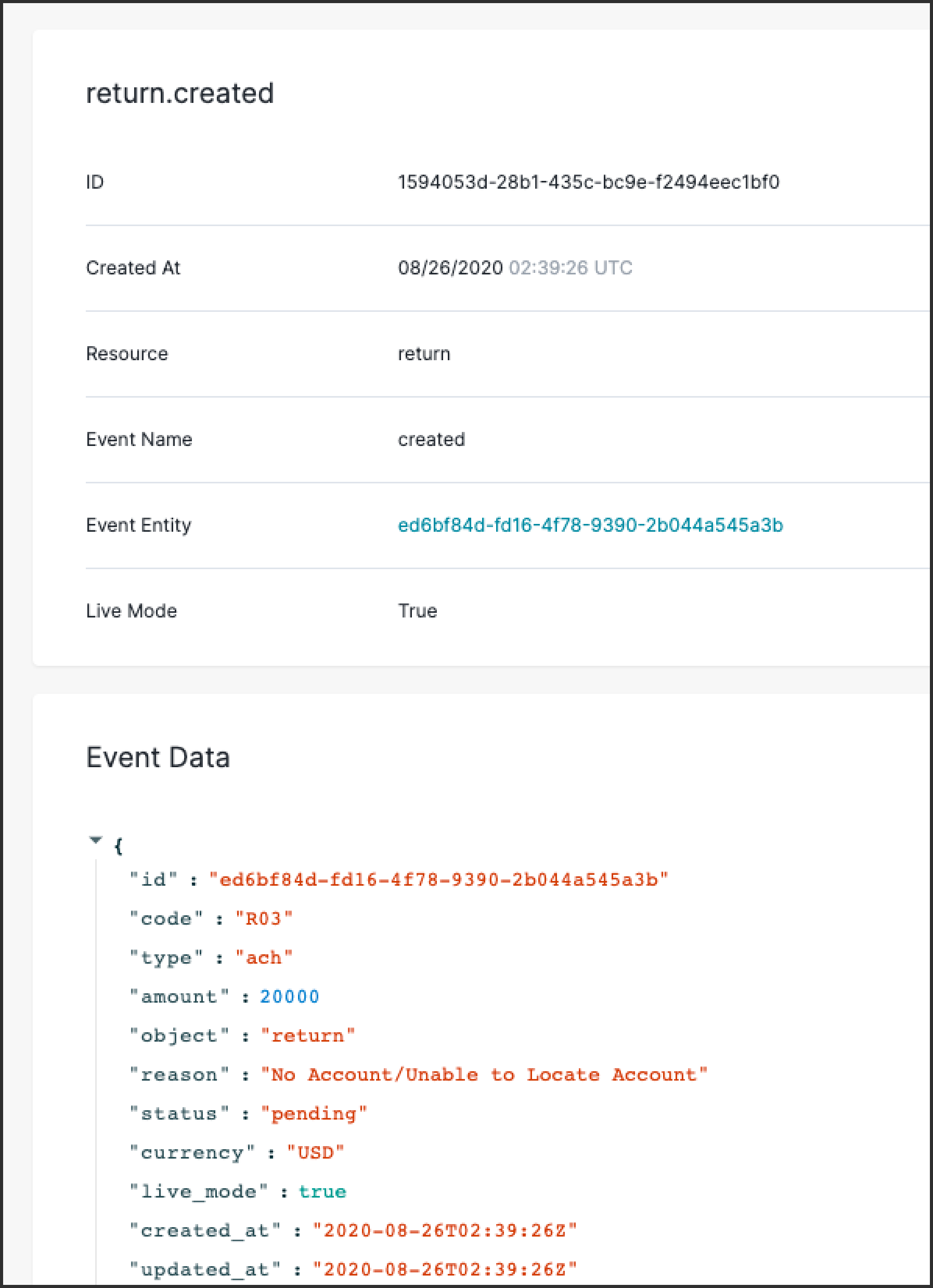 Clicking on any of the events will lead you to a dedicated event details page, which details the event’s description, data, and webhook delivery attempts associated. Below, we see a “return.created” event and all the information related to that return creation. Since the event entity is a Return object, clicking on the highlighted event entity ID will bring you to the page of the actual Return object.