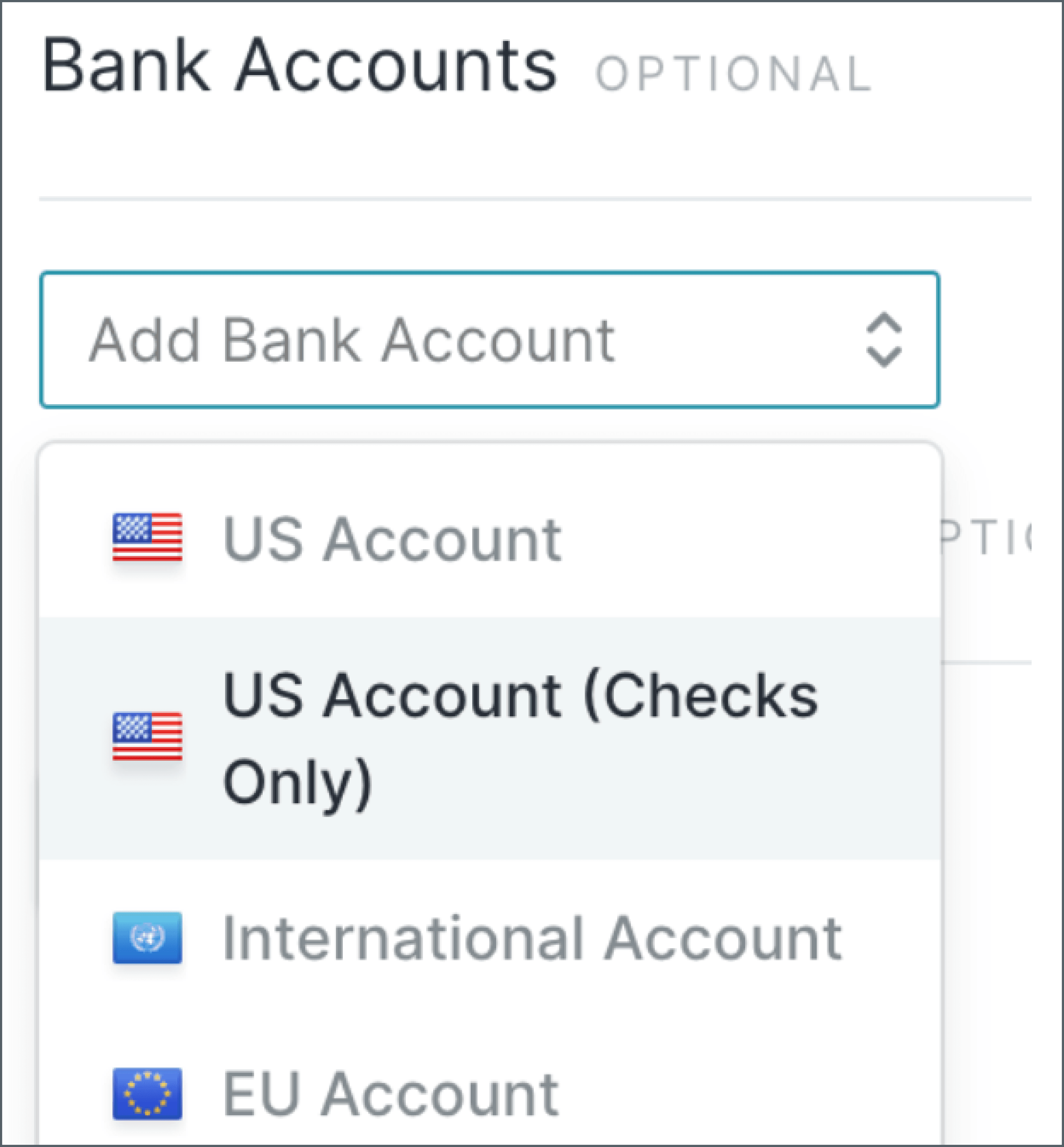 You can now create bank accounts that are “check-only.” This address-only type account can be added to a counterparty, allowing you to send checks to that bank account. Previously, we required you to also supply an account number, and now that is no longer necessary with “US Account (Checks Only)”.