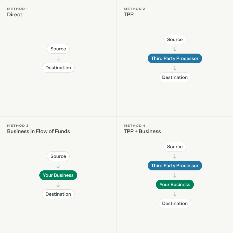 In some cases, TPPs may only offer Method 2 or Method 4 based on their agreements with their banking partner. For example, they may be forbidden to hold funds on behalf of a customer’s customer or be restricted to only paying out verified direct customers.