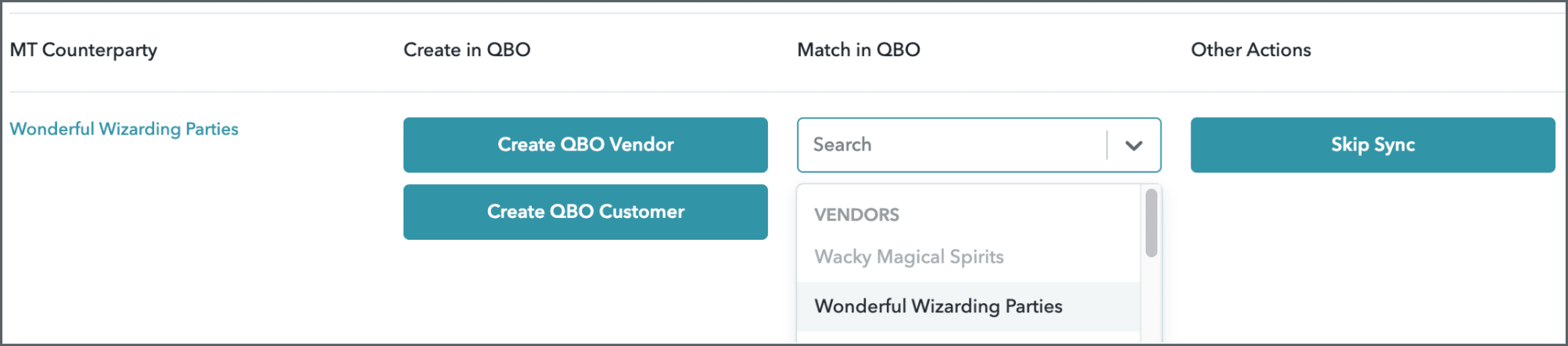 In some cases we can be confident in automatic processes. For example, QuickBooks has a restriction that no two vendors, customers, or employees have the same name. So we built a system that matches Modern Treasury counterparties to QuickBooks records. For one of our clients, it matched 530 of their 580 vendors correctly. And for the ones that didn’t resolve to a match, they used our app to map them to existing vendors in QuickBooks in under 10 minutes. This enabled them to avoid duplicating vendors that would later have to be merged.