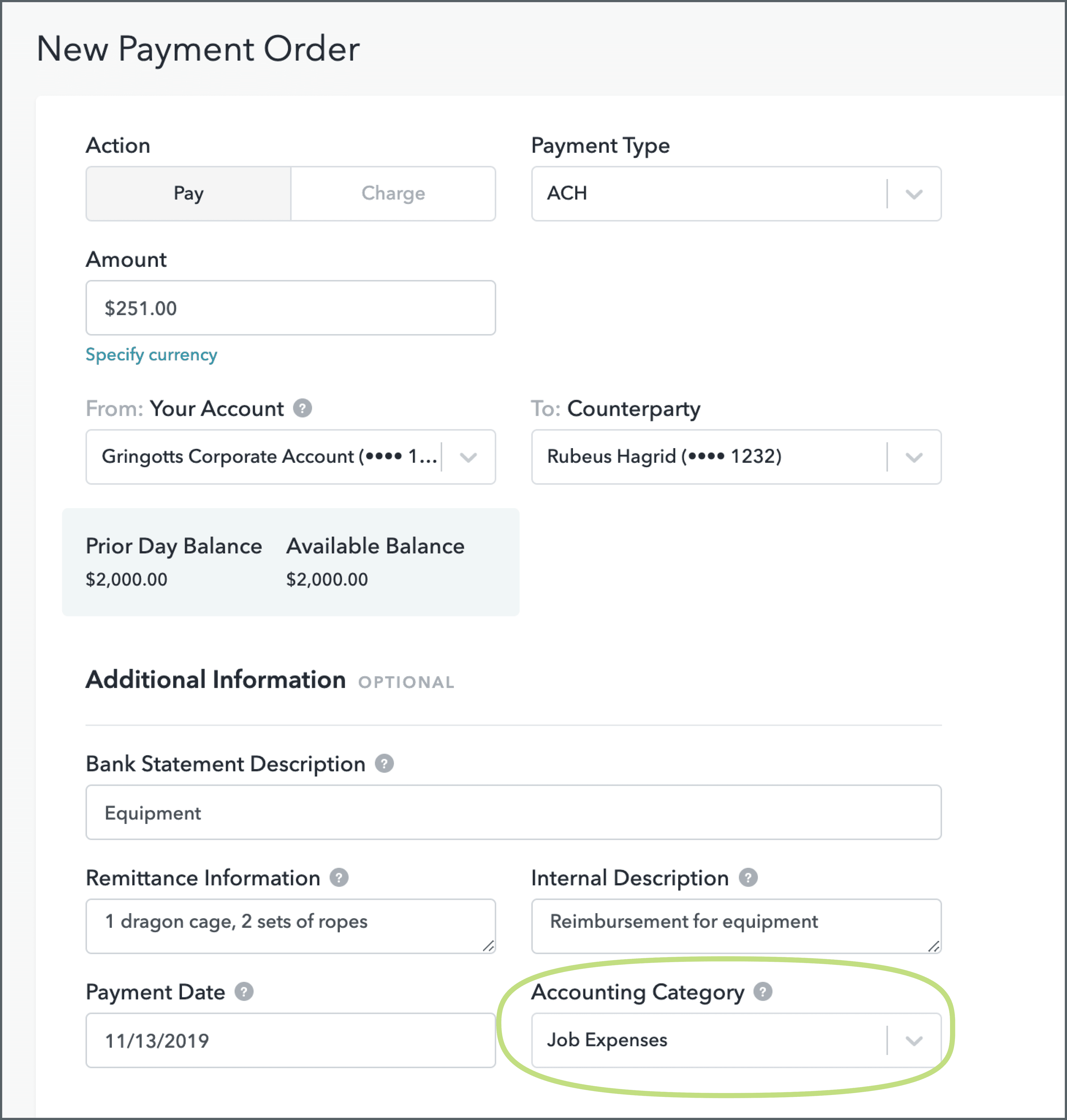 If you don’t want to apply categories on each line item, a single category can be applied to the payment as a whole. Or, if the category is only different for a single line item, that can be specified and take precedence over the payment’s category.