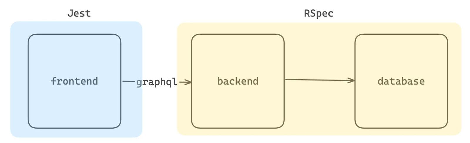 Previously, our only test coverage for frontend code was through integration tests. In many cases, it’s a simple improvement to convert the same coverage to a unit test in Jest. As you can see in the diagram though, there is a small coverage gap: our Jest tests would be unable to ensure that the frontend and backend are hooked up correctly.