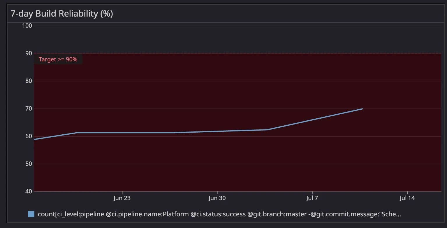 On the Modern Treasury engineering team, we had a build reliability problem. Build reliability—the percentage of builds encountering one or more failures when running our full battery of tests—had been lower than 60% for a while, and was blocking engineers from shipping fast. Unreliable builds can be very painful for a high velocity organization like ours that ships hundreds of commits per week. Flaky integration tests, written with Cuprite, Capybara and RSpec, were the culprit.