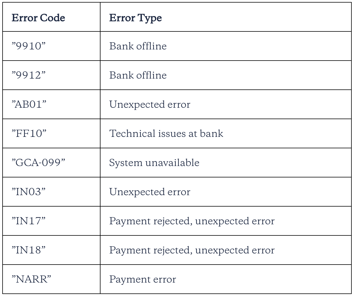 Retryable errors include: