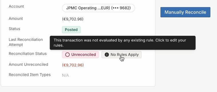 Users can now view detailed explanations for unreconciled transactions, allowing them to debug why a transaction did not reconcile and improve their reconciliation rules. In the reconciliation UI, under the Transaction Detail View, users may now see “Reconciled” / “Unreconciled” and an additional status, when applicable, detailing why a transaction did not reconcile. These statuses include the following: