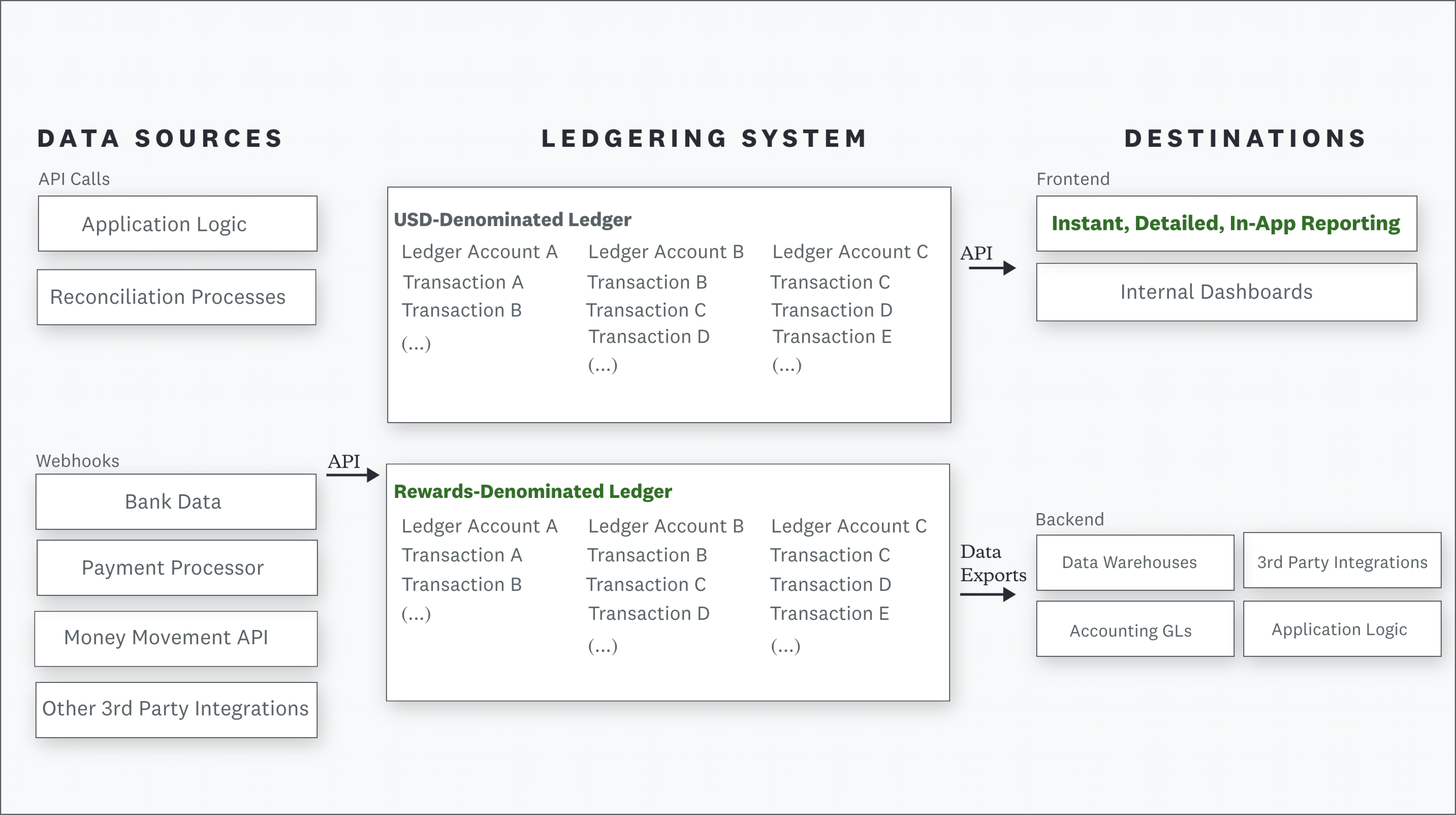 - Data sources: Data on transactions happening in-app can be pooled from external providers, in-house systems, or manual processes. External providers could be payment processors, card issuers, or banks. When a user of Modern Billing executes a payment, the payment processor will send a transaction record via webhook that can be stored in the ledger. If the Modern Billing ops team needs to make any adjustments, they can make changes to the ledger via an internal dashboard. The number of sources can vary: as long as Modern Billing has a clear, unifying logic for categorizing transactions, it can organize transaction data in a single application ledger.