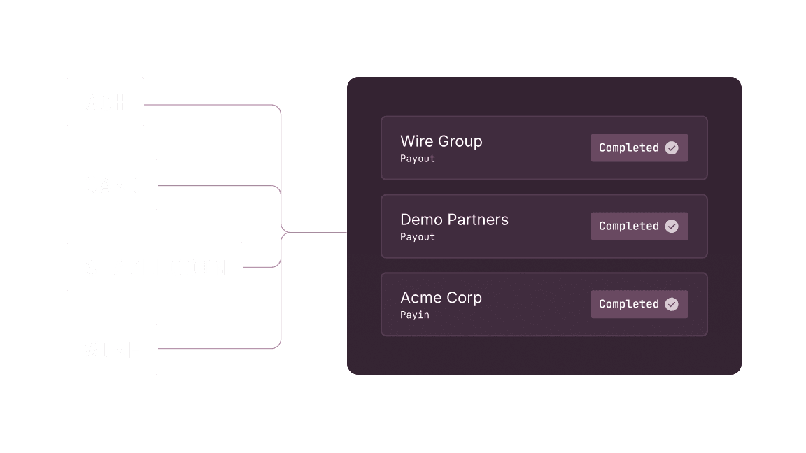 Collect or send funds over ACH, wire, RTP, FedNow, push-to-card, or stablecoins with one API.